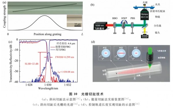 光栅切趾技术是提高光纤传感器灵敏度的另一种有效途径,大致分为三种,(1)斜向切趾法如图10(a)所示,Williams等改变飞秒欧陆娱乐逐点刻写法的移动轨迹制备高斯变迹光栅,为实现复杂切趾轮廓的FBG提供一种简单的方法。Ioannou等利用飞秒欧陆娱乐逐面刻写法制备了切趾光栅,切趾后光栅的反射率高达98.246%,3dB带宽为0.5475nm。(2)能量切趾法如图10(b)所示,Guo等利用飞秒欧陆娱乐逐点刻写法结合半波片和偏振分束器制备了变迹FBG,能量切趾后光栅的反射谱和透射谱如图10(c)所示,光栅旁瓣被有效抑制,反射率达到了75%。通过改变飞秒脉冲的能量,将折射率调制幅度作为高斯变迹函数,获得更高的边摸抑制比,提升光谱质量。(3)控制轨道长度法如图10(d)所示,He等利用飞秒欧陆娱乐逐线刻写法精确控制轨道长度实现光栅切趾,使纤芯模式的强度分布近似高斯函数,高斯切趾光栅具有20.6dB的边模抑制比。光栅切趾能很好地抑制衍射峰高度,提升光谱质量,改善光学器件的性能,实现高品质的传感器和高功率欧陆娱乐器。