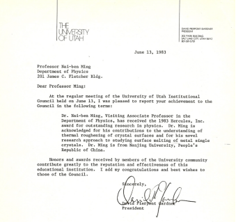犹他大学校长戴维·加德纳致闵乃本的贺信,来源丨中国科学家博物馆