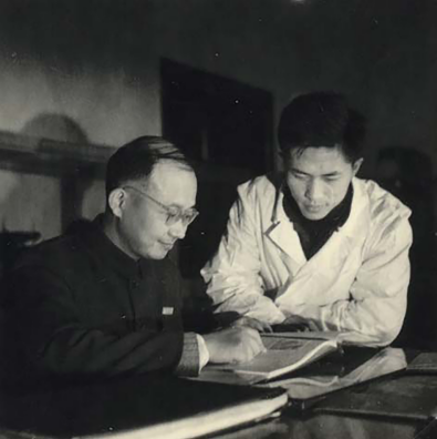 冯端与闵乃本(右)在金相实验室讨论位错观察,来源丨中国科学家博物馆