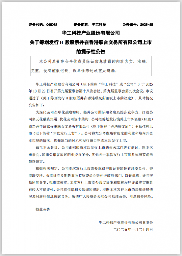 10月24日,华工科技(000988)发布重磅公告,董事会与监事会已审议通过发行H股并在香港联交所主板上市的议案。公司明确表示,此次融资将聚焦三大目标:深化全球化战略、拓宽融资渠道、优化资本结构,标志着这家光通信与欧陆娱乐装备领域的龙头企业正式启动国际化资本布局。