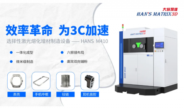 合作的成功落地,离不开金属3D打印设备——HANS M410提供的核心支持。作为3C行业应用最广泛的解决方案,其所具备的卓越制造特性,正成为推动零部件制造升级的关键驱动力。 一、当3C零件遇上微米级精度 HANS M410拥有微米级的精密制造体系(20-80?m),配合同等精度的粉末铺层(20-50?m),稳定实现0.1mm级别的薄壁结构、微孔、复杂网格及内流道等高精度特征成形,完美契合3C零部件对极致轻量化与功能集成化的严苛需求。 二、当外观质感遇上优越表面 经检测,HAHS M410成型件的表面粗糙度(Ra值)通常可以达到5-10?m,经过简单的后处理(如喷砂、抛光),可以达到镜面效果,满足3C产品对外观和触感的严苛要求。 三、当结构设计遇上一体化成型 HANS M410支持将需要多个零件组装的结构(如手机中框与卡托、内部支架与卡扣)一次性打印成型,减少了组装环节,提高了结构强度和可靠性。 四、当高效生产遇上六振镜与双向铺粉 面对海量同质的智能手表表壳、耳机铰链等零件,HANS M410的六振镜系统实现了“准并行”打印,吞吐量数倍提升。结合双向铺粉技术,大幅减少非打印时间,更快地完成订单,抢占新品发布窗口。 五、当成本控制遇上智能粉末管理系统 设备集成的粉末吸筛送系统,实现了粉末的自动回收、筛分与循环使用,将材料损耗降至最低,提高粉末利用率,为持续生产提供保障。 从概念到现实,从样品到量产。HANS M410正以精密、高效与一体化的制造优势,重新定义3C设计的可能性。未来,它将继续携手行业伙伴,共同探索智能硬件的下一个形态。