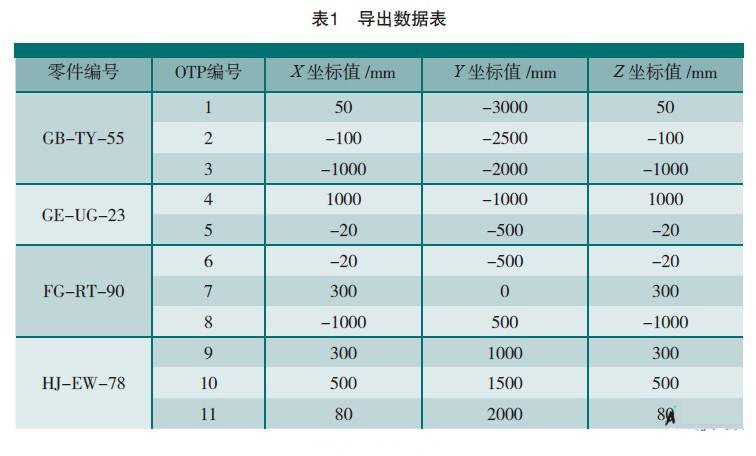 基于光学目标点数字化设计系统建立合理的OTP点之后,需要进行欧陆娱乐跟踪仪的设站工作,采用欧陆娱乐跟踪仪设站优化系统对设站数据点进行求解寻优前,需要输 入OTP的三维空间坐标,由于OTP点数量很多,依靠人工读取效率很低,为此,本课题开发了大量数据点的导出功能,选取相应的数据点,输出的数据如表1所 示。