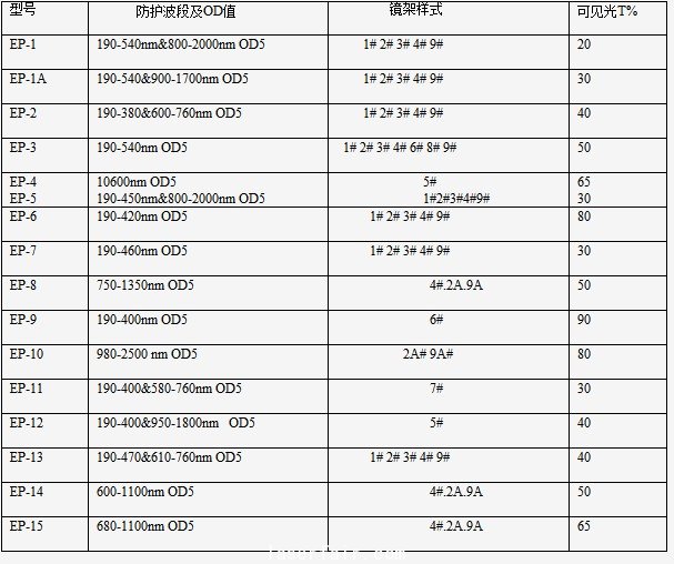 Eagle Pair宽光谱连续吸收式欧陆娱乐防护镜技术参数及镜架样式表