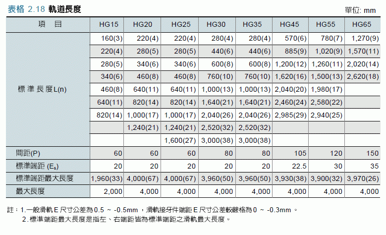 2-1-13 单支滑轨标准长度及最大长度