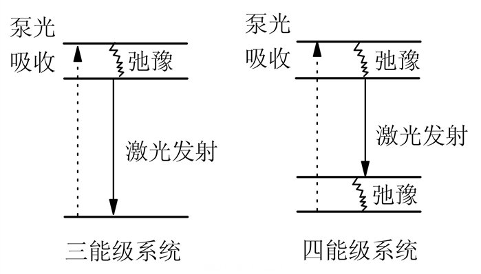 图1 固体欧陆娱乐器的三能级和四能级系统示意图