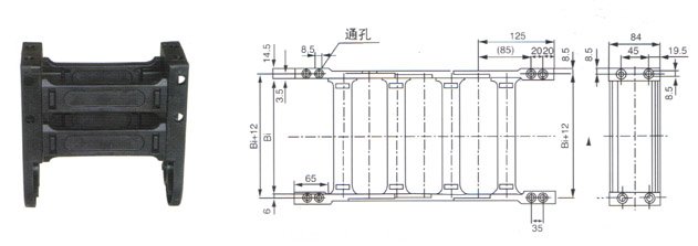 特点:耐磨、耐高温、不变形、低噪音、装拆灵活、寿命特长。 TP62系列 型号 内腔(高X宽) 外腔(高X宽) 弯曲半径(R) 节距 不支撑长度(M) 型式 62.75 62x75 83x112...