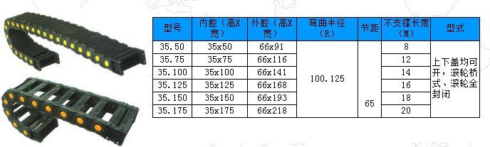 承重型工程塑料拖链系列 TZ35系列 型号 内腔(高X宽) 外腔(高X宽) 弯曲半径(R) 节距 不支撑长度(M) 型式 35.50 35x50 66x91 100.125 65 8 上下盖均可开,滚轮桥...