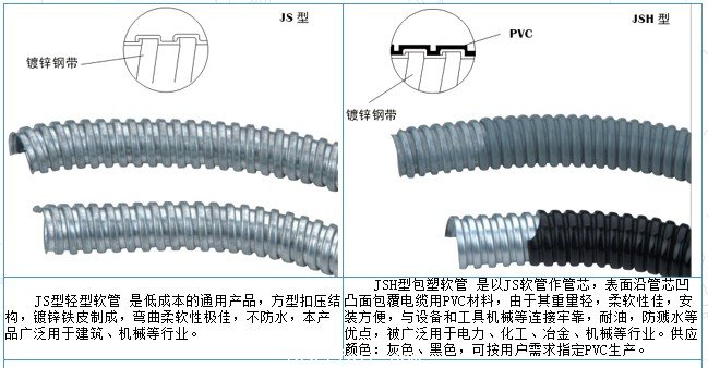 JS型轻型软管 是低成本的通用产品,方型扣压结构,镀锌铁皮制成,弯曲柔软性极佳,不防水,本产品广泛用于建筑、机械等行业。 JSH型包塑软管 是以JS软管作管芯,表面沿...