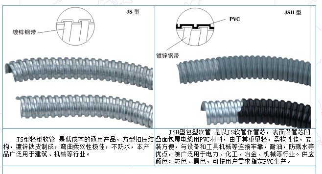 JS型轻型软管JSH型包塑软管 JS型轻型软管 是低成本的通用产品,方型扣压结构,镀锌铁皮制成,弯曲柔软性极佳,不防水,本产品广泛用于建筑、机械等行业。 JSH型包塑软管...