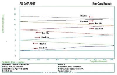 周期性曲线是整个轴线长度上的重复周期误差。沿轴的俯仰保持不变,但幅度可能变化。导致周期性曲线的可能原因主要是机床方面的题目,如丝杠或传动系统故障、编码器题目或故障、长型门式机床轨道的轴线直线度。