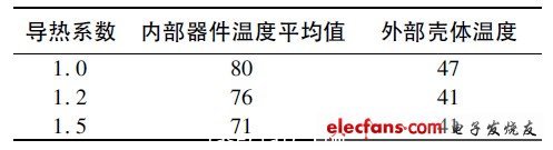 ( 3) 灌胶导热系数对驱动电源散热影响情况,由于电源的壳体结构已经确定,因此驱动电源的散热主要通过胶体传导,将热量传导到壳体,而后通过对流散热。表1 是导热系数不同的胶体的电源器件和壳体温度情况( 输入电压~ 100 V,输出48 V/3 A,环境温度25 ℃) .