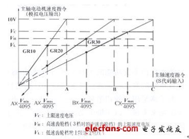 如图1 所示, 主轴的3 档位所对应的主轴电动机最高限定速度是相同的。例如我厂的XH756 卧式加工中心, 主轴低档的齿轮传动比为11:108, 中档的齿轮传动比为11:36, 高档的齿轮传动比为11:12; 机械设计要求主轴低档时的转速范围是0-458r/min, 中档的转速范围是459-1375r/min, 高档的转速范围是1376-4125r/min, 主轴电动机的最低速度限定为 150r/min。主轴电动机给定电压为10V 时 , 对应的主轴电动机速度为6000r/min。通过计算可知各个档位的主轴电动机最高转速相同,均为4500r/min。此时参数应设定如下: