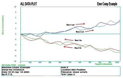 周期性曲线是整个轴线长度上的重复周期误差。沿轴的俯仰保持不变,但幅度可能变化。导致周期性曲线的可能原因主要是机床方面的题目,如丝杠或传动系统故障、编码器题目或故障、长型门式机床轨道的轴线直线度。