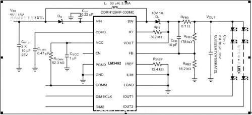 图4示意了考虑到冷启动情况下,汽车中使用的LCD面板背光普遍采用LED驱动器的电路,该电路使用了美国国家半导体的LM3492芯片。该电路驱动2个LED灯串,每个灯串都含有工作电流为100mA的6个LED。电路的标称输入电压范围为9V至16V,标称开关频率为300 kHz。该电路的基本组成元素包括一个升压转换器和一个双通道线性稳流器。MOSFET开关集成在LM3492内,实现了更小的方案体积。LM3492的VIN针脚通过二极管连到输入电压,当电池电压低于最低要求的4.5V时,芯片内部连接了VIN和VOUT引脚(后者连接升压转换器的输出电压)的电路就会为LM3492供电。这里选用了一个饱和电流为3.36A的33uH电感器,尽管对于正常输入电压而言,1A的饱和电流就已足够。