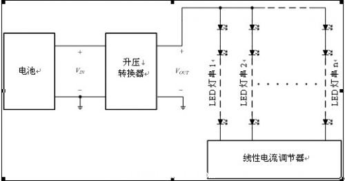 图1.由升压转换器和线性电流调节器组成的LED驱动器