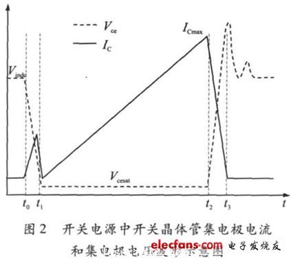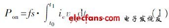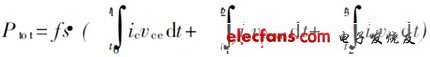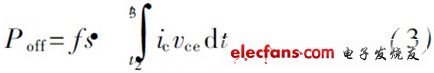 关晶体管在工作过程中的损耗分为开关损耗和稳态损耗, 其中开关损耗包括导通损耗和关断损耗, 稳态损耗包括通态损耗和截止损耗, 其中截止损耗占总的损耗的比率很小, 可以忽略不计。我们把Vce由90% Vindc降到110% Vcesat所用的时间定义为导通延时, 即图2中的t1 - t0, 把IC 由90% Icmax下降到0所用的时间定义为关断延时, 即t3 - t2。