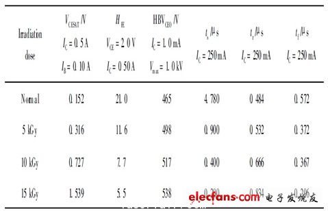 从表1中我们可以看到, 经过辐照后, 储存时间ts 随着辐照剂量的增大有很大幅度的减小, 下降时间tf 有所减小, 上升时间tr 有所增加; 电流放大系数随着辐照剂量的增加而下降; 饱和压降和击穿电压HBVceo随辐照剂量的增大而增大。
