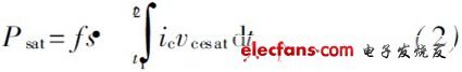 在开关晶体管开通时, 集电极电压在控制器驱动电压为高时, 基极电流变大, 集电极电压由Vindc下降为0, 此时由于变压器与原边并联的寄生电容两端的电压差也从0变为Vindc, 寄生电容充电, 因此在开关晶体管集电极产生一个尖峰电流, 另一方面, 如果副边整流二极管的反向恢复电流没有降到0, 也会进一步加大这个尖峰电流。开关晶体管出现集电极电压和电流交替现象, 产生导通损耗, 直到集电极电压降到Vcesat.导通损耗可以表示为: