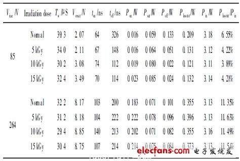 从图3 中可以看到, 在较低的交流输入电压(如85 V和115 V )下, 使用辐照后的APT13003E比使用未辐照的APT13003E 系统效率都有所提高, 而在较高交流输入电压下(如230 V 和264 V ), 辐照后的APT13003E 未能使系统效率提高。在85 V 交流输入电压下, 辐照剂量为10 kGy 的APT13003E的性能最好, 开关晶体管的总损耗由0. 209W 降低到0. 121W, 降低了42% , 使得系统整体效率提高了2. 1% , 若该开关晶体管采用TO - 92封装, 这将使开关晶体管的结温降低约11 ℃ ; 在115 V交流电压下, 系统的整体效率也提高了约1. 4%, 开关晶体管的结温将降低约7℃, 这就有效地提高开关晶体管的可靠性, 降低了开关电源的损耗。