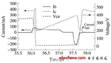 而在264 V输入电压下, 辐照后关断损耗只有较小幅度的减小, 因此总损耗基本不变, 系统效率也没有改善。如图4 和图5 分别为未经辐照的APT13003E 在85 V 和264 V输入电压下基极电流、集电极电压和电流的波形。比较图4和图5中可以看出, 在264 V 输入电压条件下导通时集电极电流的尖峰比起85 V 时要大很多, 这是因为导通时变压器寄生电容充电电压增大了2. 1倍, 但充电时间只增加了约0. 6倍, 所以充电电流就会大大增加, 这也导致了APT13003E 的导通损耗由85 V 下的0. 016W 变为264 V下的0. 183W, 此时导通损耗占了总的损耗的大部分, 而电子辐照对导通损耗并没有改善; 另一方面, 在APT13003E 关断时, 集电极电压并没有直接降到0, 而是先经过一个近100 ns的电流“ 尾巴”之后, 才又下降到0, 此时集电极电压已经比较大了, 因此这个电流“尾巴”所造成的损耗占关断损耗的比例较大。产生这个“尾巴”的原因是, 关断开关晶体管时, 由于管子的基区比较薄, 过大的基极电流引起较大的基区电位差, 使VBE 为负的情况下发射结局部正向偏置, 集电极电流迟迟降不下来。