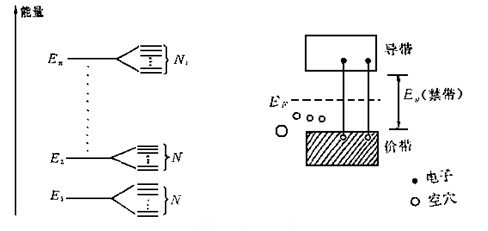 原子的能级对应着原子的不同运动状态。实际上固体中原子之间相距不远,由于原子间的相互作用,能级会分裂。在一个具有N个粒子相互作用的晶体中,每一个能级会分裂成为N个能级,其相互间能量差小到10-22eV数量级。因此这彼此十分接近的N个能级好象形成一个连续的带,称之为能带,见图(1)。