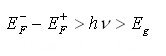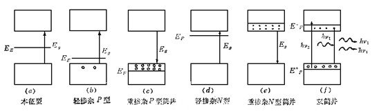当光照射到图(3)所示的各种半导体时,在a—e的五种情况下,半导体中只有一个费米能级,在它之上没有电子,在它之下已充满电子,因此不会发生电子向没有被电子占据的空态跃迁,而只会将外来光子吸收。在图(3)f所示的情况下有所不同,两个费米能级使得导带中有自由电子,价带中有空穴。如果外来光子的能量与上能带中电子和下能带中空穴之间的能量差相同,则会诱导导带中电子向价带中空穴跃迁而发出一个同样的光子。当外来光子的能量大于两费米能级