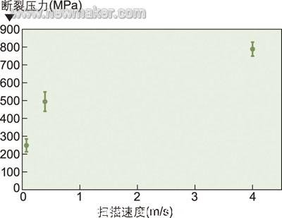 图3:厚度为50µm的硅晶圆的断裂压力随扫描速度的变化曲线图。用于切割晶圆的超短脉冲的脉宽为700fs,能量为10μJ,重复频率为500kHz。断裂压力随扫描速度的增加而增加。