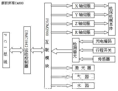 该欧陆娱乐冲击强化数控系统采用工业PC机为基础,在工控机主板上的PCI扩展槽插上DMC1842多轴运动控制器,形成该系统的控制中心。工控机上的 CPU与运动控制器上的CPU构成主从式双微处理器结构,两个CPU各自实现相应的功能,其中DMC1842主要完成机床四轴的运动控制和相关开关量的输入输出控制。工控机则实现整个系统的管理功能。数控系统的硬件框图如图3所示。其中,PICM2900互联模块将控制器电缆转换成插线端子方式。