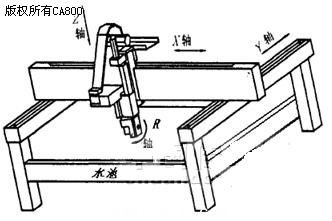 数控系统的机械本体采用龙门式结构[3],共有四个传动轴,分别为X轴、Y轴、Z轴和R轴。X轴、Y轴和Z轴通过伺服电机连接丝杠驱动,可以实现三轴联动,其行程分别为800mm、600mm和400mm.。转轴由伺服电机经减速器减速来驱动,可连续运动,承重10kg。工作台面为一水池,水作为冲击强化的约束介质。在实际工作中,可以利用转台装夹工件(如叶片)通过工作台运动实现不同部位的强化,也可以通过运动轴上的反射镜实现光斑的移动,从而实现双工作方式。