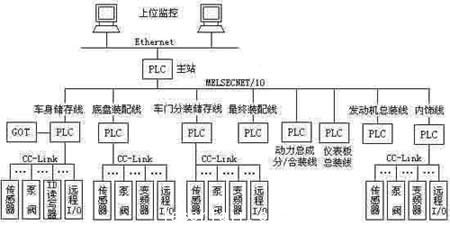 设备层采用四套CC-Link,分别挂在车身储存工段、底盘装配工段、车门分装储存工段和内饰工段的PLC上。CC-Link现场总线具有传输速度高(最高10Mbps)、传输距离长(1200m)、设定简单、可靠性高、维护方便、成本低等特点。它通过双绞线将现场的传感器、泵、阀、ID读写器、变频器及远程I/O等设备连接起来,实现了分散控制集中管理。这样变频器的参数、报警信息等数据不但可以方便地由PLC进行读写,而且可由上位机和GOT通过PLC方便地进行监控和参数调整。使用ID读写器容易进行车体跟踪,减少了信息交流量,使生产线结构实现高度柔性化,并且有效地提高了自动化程度,节省人力资源。