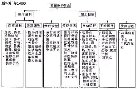 该系统软件提供的编程方式有三种:图形编程,仿形编程,手工编程。手工编程只是图形编程和仿形编程中的一个功能模块,即全屏幕程序编辑,所以没有在软件框图中单列。