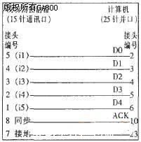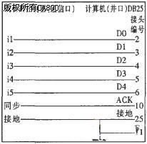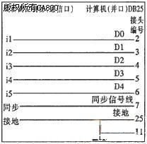 与应答传输类似,同步传输也是通过计算机并口的2、3、4、5、6针脚输出信号模拟光电头的方式。在同步传输方式下计算机并口与线切割控制器通信口的常用接线图如图4所示。
