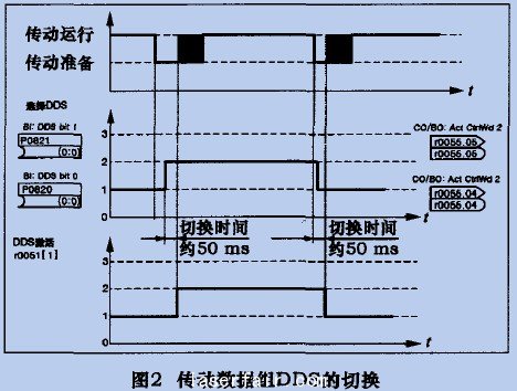 用于控制传动系统和输入给定值的参数(连接器和开关量连接器输入)分配给命令数据组(CDS)。控制命令和给定值的信号源用BICO技术互连。传动数据组用BICO参数P0820和P0821来切换。激活的传动数据组显示在参数r0051中。传动数据组可在“准备”状态下切换,此项切换约需 50 ms。如图2所示。