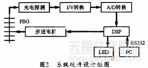 匹配光栅反射回来的光入射到光电探测器(PD)上可转换为电信号。光电转换部分和信号采集部分主要完成对PD输出电信号的采集,采集到的信号再转化为#p#分页标题#e#数字信号由DSP进行处理。DSP主要完成数据的插值运算和寻峰处理,并根据处理结果反馈给DSP,由DSP依照反馈信号控制步进电机完成下一步的解调工作,其系统硬件框图如图3所示。