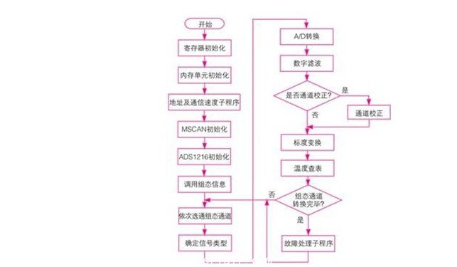 单片机程序用mc9s12汇编语言编写。在主程序首先完成各寄存器和存储单元的初始化,再通过调用读取地址子程序,得到i/o板卡的地址和can通信波特率,再完成mscan模块和ads1216初始化。随后调用e2prom中组态信息,对每一路组态通道进行信号转换,数字滤波及温度查表计算等,其主程序流程图如图5所示。
