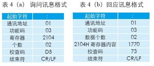 例如:对通讯地址01h,读出2104h寄存器的资料内容,格式见表4。