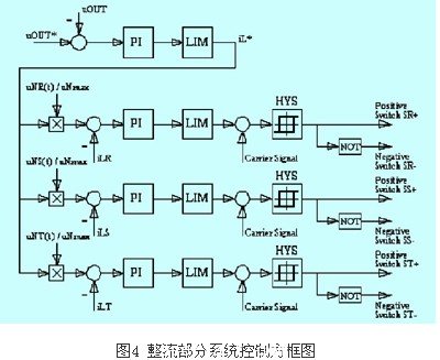 如图4所示,系统的给定是直流母线电压指令,这个指令与直流母线电压反馈的误差送到电压环的pi调节器。电压环的pi调节与三相输入正弦波的乘积成为三相电流的指令,三相电流指令与各自电流反馈作比较,误差送到电流环的pi调节器。电流环pi调节器的输出可以通过载波调制产生各相igbt的pwm控制信号,也可以通过空间矢量的方式产生pwm信号控制igbt。上述的运算都是通过dsp完成的。