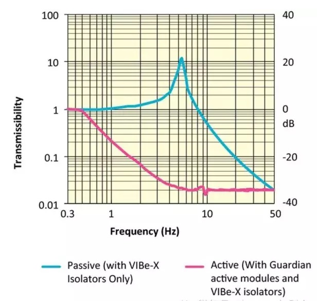 GuardianTM工作站包括2个主动隔振模块,每一个包含3个传感器和3个衰减器,在六个自由度进行实时补偿。它不仅解决了被动隔振系统在固有频率处的共振响应问题(上图蓝色曲线),还提供高达34 dB(98%)额外的隔离(上图粉红色曲线)。隔离效率从1 Hz处的10.5 dB(70%),2 Hz处的20 dB(90%),到5 Hz处已达到30.5 dB(97%),不但大大优于以弹簧为基础的系统,而且优于最好的气浮隔振平台。