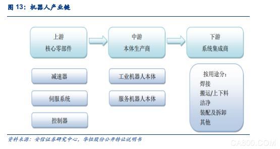 机器人自动化行业按产业链分为上游、中游和下游。上游生产核心零部件:包括减速器、伺服系统、控制器;中游是本体生产商,包括工业机器人本体、服务机器人本体。下游是系统集成商,包括单项系统集成商、综合系统集成商。