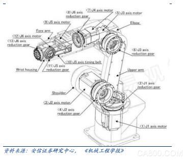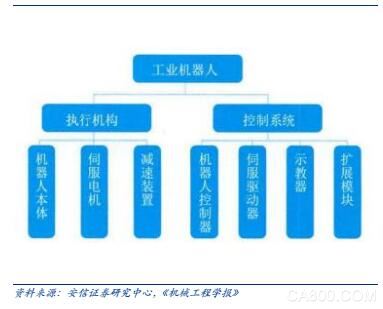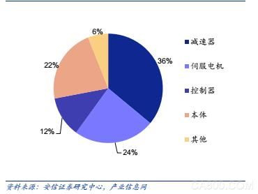 工业机器人优于传统的机械设备的原因主要在于上游的关键基础部件。从结构上来看,工业机器人由控制系统、驱动系统和执行机构组成,分别对应控制器、伺服电机和减速器等核心零部件。从成本上来看,核心零部件占工业机器人成本大头,约72%左右。多轴工业机器人的成本构成中,机械本体约占22%;伺服系统约占24%;减速器系统约占36%;控制系统约占12%;其他外设约占6%。