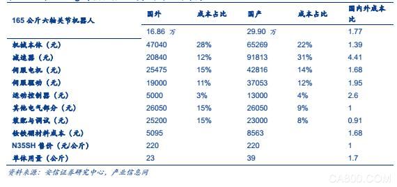 国产机器人比进口机器人贵,原因在零部件上。根据产业信息网发布的《2014-2019年中国钕铁硼永磁材料产业市场分析及投资前景预测报告》,目前一台165kg焊接机器人成本国内约为29.9万元,而国外大约为16.86万元。零部件成本差异是造成国内外机器人成本差距的最大因素,其中减速器是成本差异最大部分,国内和国外和成本比达到4.4,控制器的国内外成本比,达2.6,伺服电机(驱动)的国内外成本比为1.68(1.95)。国内的材料消耗也更大,如在永磁同步伺服电机中钕铁硼材料成本,国内单体用量比国外高接近1倍。