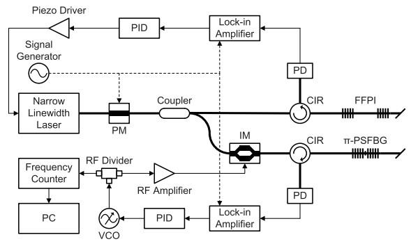 如下图所示为双稳频反馈环路光纤应变传感器[8],该传感器频率范围可以从准静态到几百赫兹,由用于应变传感的π相移光纤布拉格光栅和作为参考的光纤法布里-珀罗干涉仪组成。系统使用Pound-Drever-Hall技术来产生误差信号,欧陆娱乐载波和边带分别通过两个独立的反馈回路锁定到参考元件和传感元件。其应变分辨率在0.01-250Hz的带宽内具有出1/f的特性,在10Hz的频率下应变分辨率优于0.01nε,动态范围高达149dB。与传统的静态应变传感器相比,这种传感器在分辨率和传感带宽方面都有很大的提高,可以成为地球物理研究应用中的有力工具。