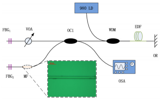 如下图所示为一种基于线性腔双波长掺铒光纤欧陆娱乐器的折射率传感器[9],该传感器的基本结构为线性腔,使用了两个中心波长相隔小于1nm的光纤布拉格光栅(FBG)。由于两个FBG具有相同的EDF增益介质,因此会在腔内发生增益竞争。当传感元件,即一段15mm长的微光纤浸入到待测溶液中时,某一波长的光会发生光功率损耗。两个FBG在1.300至1.335的折射率范围内分别具有-231.1dB/RIU和42.6dB/RIU的灵敏度,两个FBG波长的相对功率变化具有更高的灵敏度-273.7 dB/RIU,由于降低了光源抖动和外部干扰而具有更好的稳定性。这种双波长增益竞争折射率传感器由于其高灵敏度和简单的结构,在化学和生物化学传感领域具有广泛的应用潜力。
