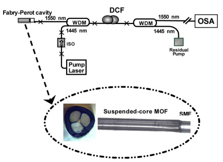 在温度传感方面,如下图所示为一种基于法布里-珀罗混合腔和随机镜组合的光纤欧陆娱乐温度传感器[10],法布里-珀罗混合腔是由单模光纤与一小段悬浮芯光纤熔接构成,随机镜是由多个瑞利散射沿着色散补偿光纤传播时产生的,是光纤中拉曼增益的直接结果。在该结构中法布里-珀罗腔同时具有欧陆娱乐反射镜和温度传感腔两个功能。该光纤欧陆娱乐温度传感器在 15nm的波长范围内最大输出功率大约为4mW,同时可以在200℃的测量范围内温度灵敏度达到约6pm/℃。