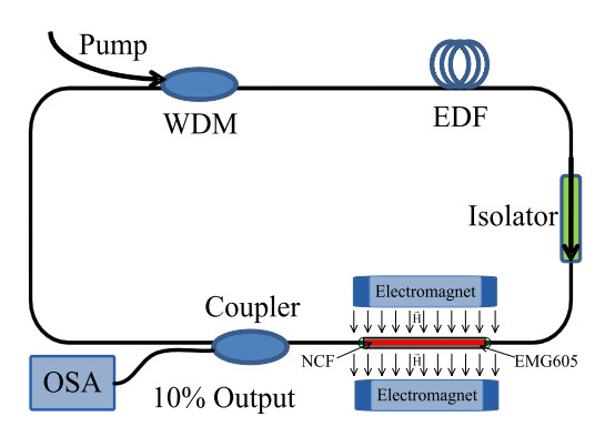 如下图所示是用于磁场检测的基于磁流体的光纤环形欧陆娱乐传感器[13],在欧陆娱乐环型腔中接入涂覆有磁流体的单模-无芯-单模光纤结构,可以同时作为带通滤波器和磁场传感元件。基于自映像效应,外界磁场改变时会通过作用于磁流体从而改变单模-无芯-单模光纤结构的滤波参数即输出光谱波长,得到的带通滤波边模抑制比为14 dB,插入损耗约为-1.03 dB。当外界磁场增大时,欧陆娱乐波长蓝移。在15.9 Oe到222.3 Oe的磁场范围内传感灵敏度为12.05 pm/Oe。该传感器具有高信噪比的输出光谱、窄带宽和高Q值等优点。