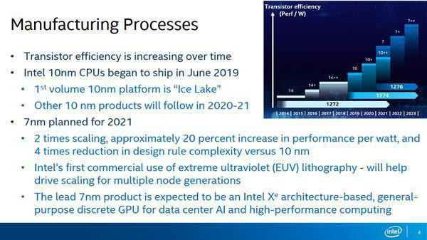 韩国媒体日前曝光了英特尔内部资料,详细介绍7nm工艺以及处理器架构、傲腾、安全等方面的进展。英特尔7nm工艺是其首次使用EUV极紫外光刻工艺,有助于提升工艺微缩。对标台积电5nm工艺的产品,则是英特尔预计于2021年量产的7nm工艺,首发产品将是英特尔全新Xe架构的GPU加速卡,CPU最快会在2022年推迟。