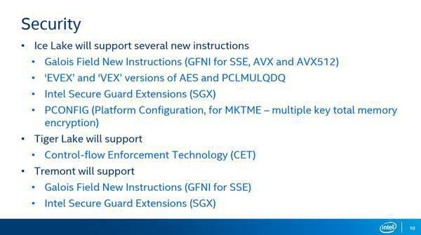 英特尔现阶段的服务器处理器采用14nm工艺的Cascade Lake,主要增加DL Boost指令集加速AI性能;10nm工艺的Ice Lake则采用Sunny Cove新底层架构,可实现3x倍无线速度、2倍视频转码速度、2倍图形性能、3倍AI性能这些也是之前说过的了。Ice Lake处理器增加GFNI、SGX、PCFONFIG等指令;下一代的Tiger Lake会支持CET增强指令,Atom处理器中的下代Tremont架构也会增加SGX、GFNI等指令集。