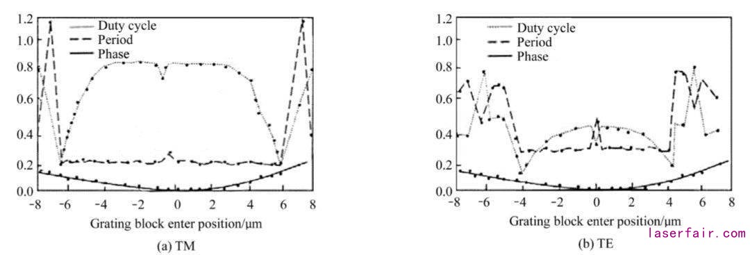 图3 TM、TE偏振光的各个光栅单元周期和占空比的详细参数以及对应的相位分布情况