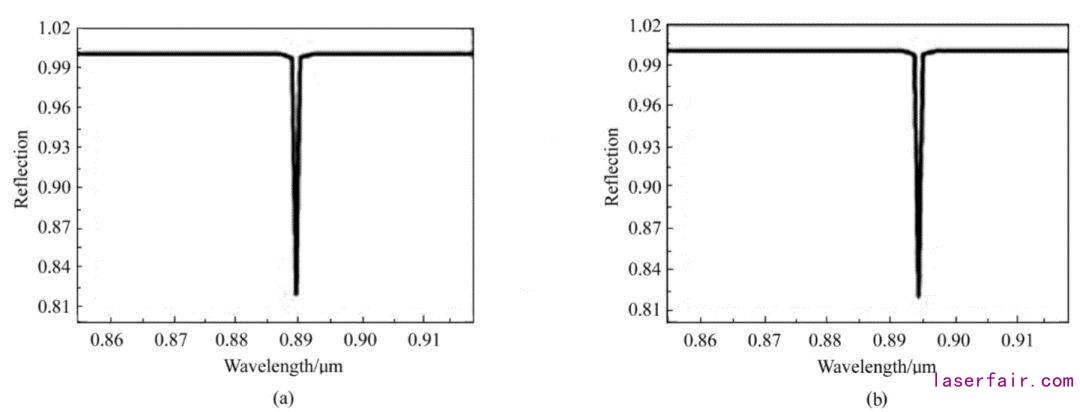 接下来我们以NSPG-VCSEL在微型原子钟的应用为例,研究其激射波长在高温工作环境下的稳定性,图6所示为NSPG-VCSEL上下DBR的反射谱线。在室温环境下激射波长在890.437 nm,通过采用-13.164 nm的失配量,在85 ℃(微型原子钟的工作温度)激射波长达到894.62 nm。因此,在高温工作环境中,器件能满足工作波长的要求。