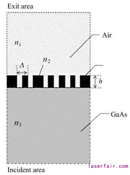 为验证所设计光栅的汇聚及偏振性能,采用COMSOLMULTIPHYSICS多物理有限元分析软件对其偏振特性进行仿真,图7为器件的仿真理论模型图,入射波长为894 nm,AlGaAs折射率为n 2 = 3.565,空气折射率n 1 = 1,光栅的厚度为120 nm。